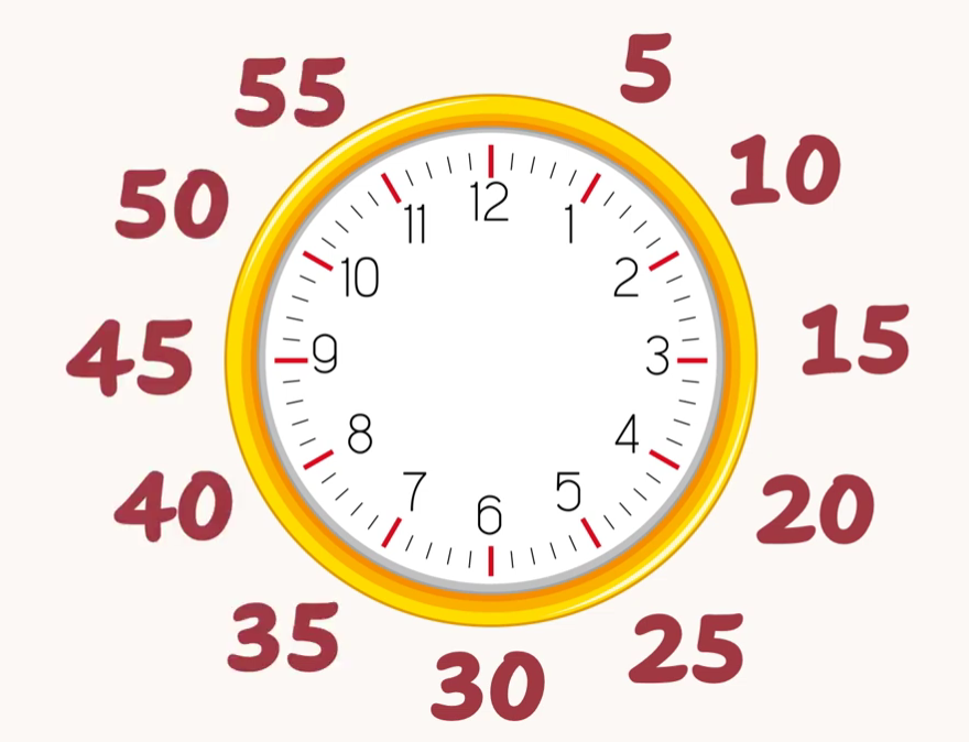 To know the number of minutes that have passed, remember that the clock is divided into 5-minute sections. Each number on the clock represents 5 minutes.