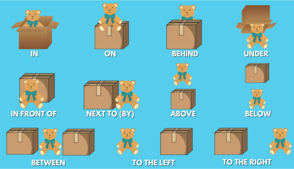 Prepositions of place are words that tell us where something is. They help us describe locations, give directions, and talk about our rooms, school, or city.