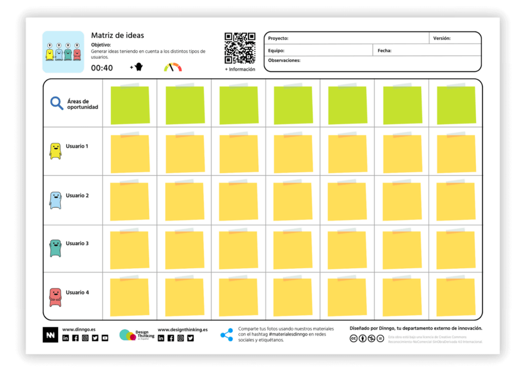 Crearemos una tabla en la que colocaremos en la primera columna, todas las áreas de responsabilidad y oportunidad que hayamos seleccionado, y en la primera fila todos los usuarios involucrados en la solución. En cada intersección debemos generar ideas que aporten valor basándonos en esa área de responsabilidad y usuario en concreto.