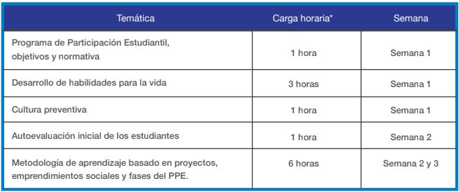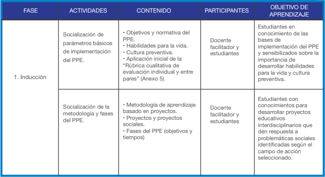 Es el momento en el que el docente facilitador informa de manera concreta a los estudiantes, tanto de primero como de segundo curso de bachillerato: el objetivo del PPE, la normativa vigente para su cumplimiento, los ejes transversales del programa, la metodología de trabajo, y el cronograma a cumplir. Esto con la finalidad de que los estudiantes contextualicen el por qué y para qué del tiempo que van a invertir en el PPE, se empoderen de su rol activo en la transformación social y generen estrategias innovadoras de resolución de problemáticas sociales.